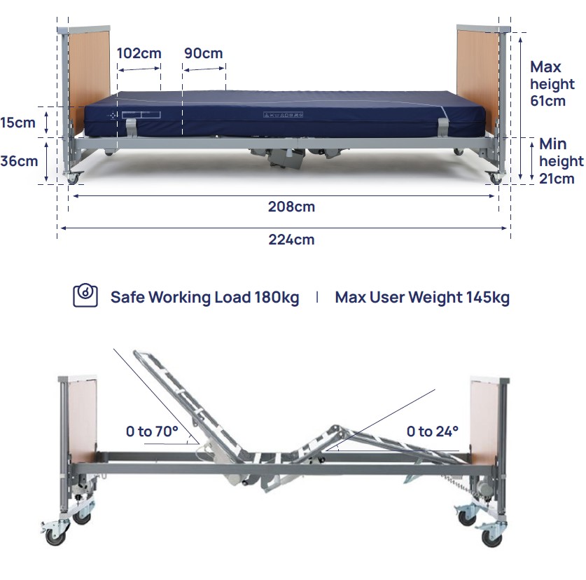 This Low Bed design helps individuals get in and out of bed more easily, supporting independence and comfort. The mattress platform adjusts between 21cm and 61cm, and the backrest and knee section are fully electric and controlled via a handset.