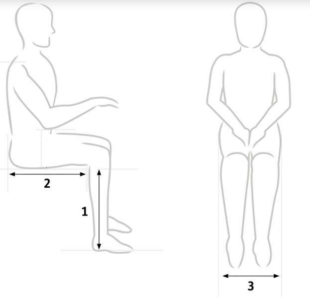 1. Seat Height: Allow your feet to rest flat on the floor and measure to the popliteal fossa (back of the knee).